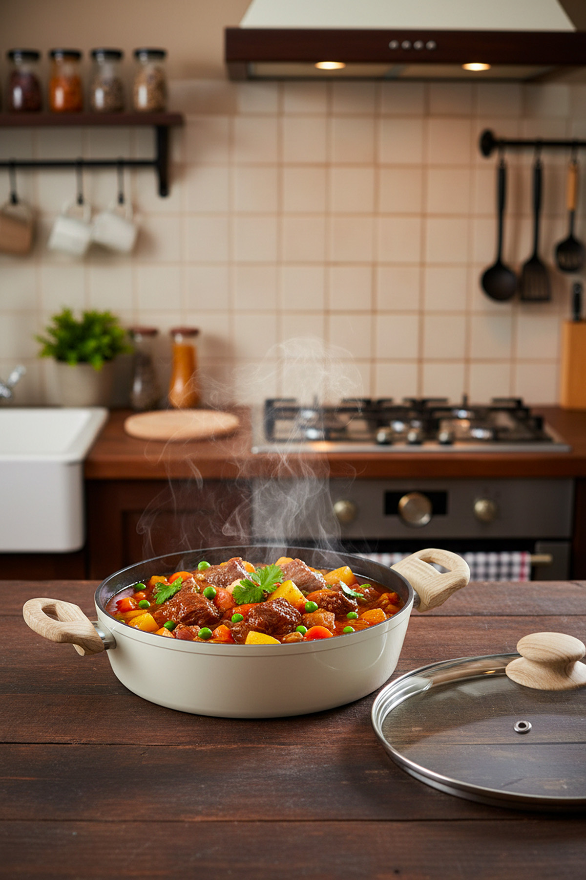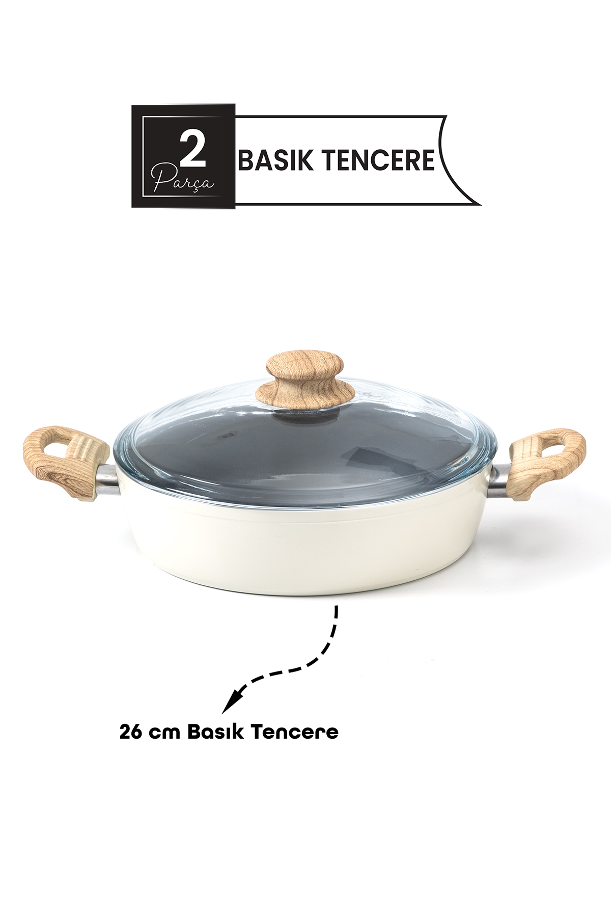 26 cm Seramik Basık Karnıyarık Tencere – Ahşap Kulplu, Cam Kapaklı, Krem Renk Yapışmaz Tencere