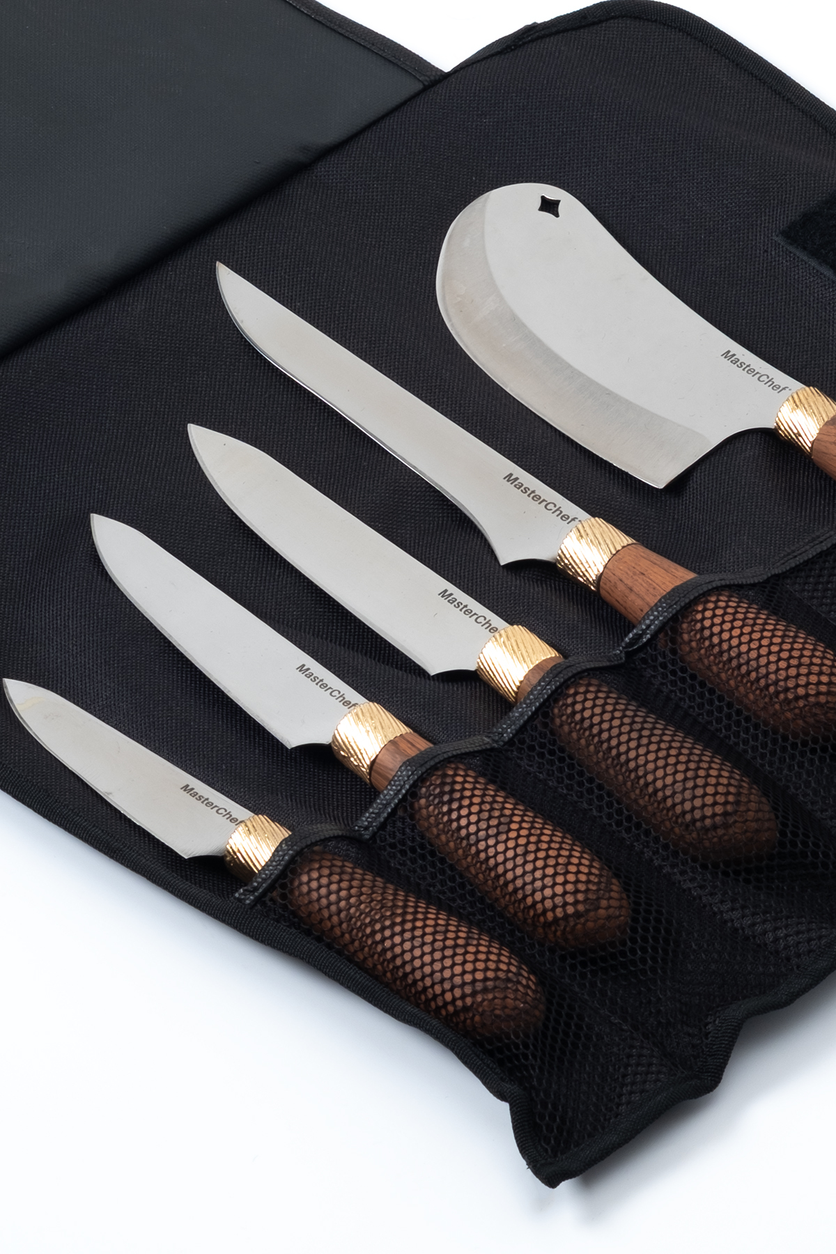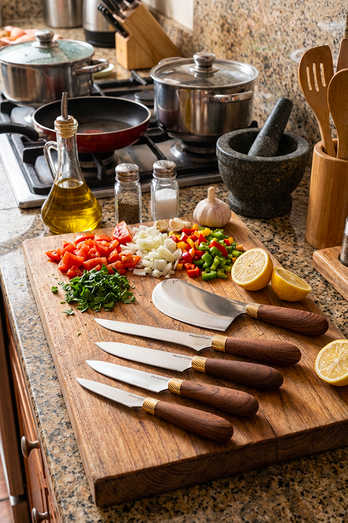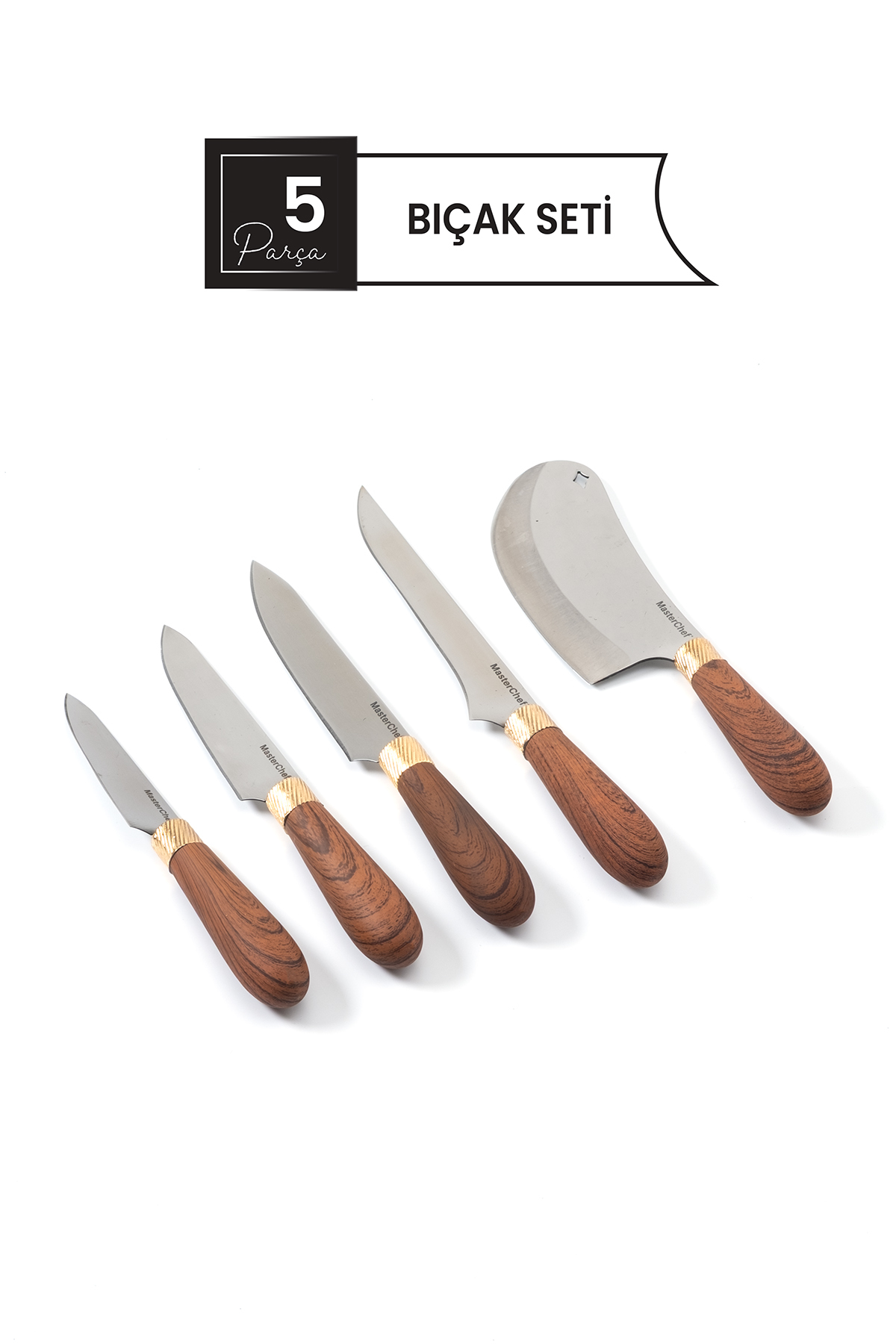 5 Parça Ahşap Görünümlü Saplı Bıçak Seti – Paslanmaz Çelik, Satırlı Profesyonel Mutfak Takımı