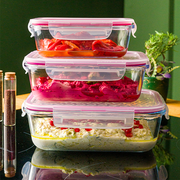 Sızdırmaz kapaklı tasarımları, taşıma ve saklama esnasında maksimum güvenlik sağlar. Şeffaf cam gövdeleri, içeriği kolayca görmenizi sağlarken; koku, leke veya tat transferi yapmaz.